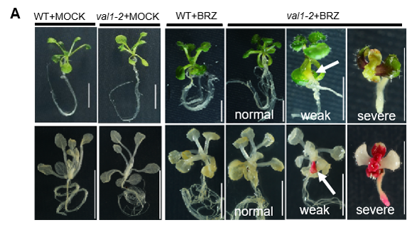 图1:BRZ诱导val1-2 幼苗产生胚性表型