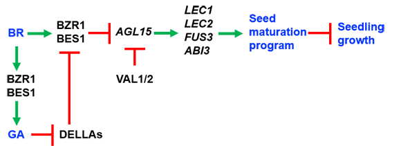 目前的研究发现由LEC1、LEC2、FUS3和ABI3组成的LAFL转录调控网络,在种子发育阶段起着非常重要的作用。因此,对LAFL的精准调控显得非常重要。遗传分析表明,在种子发育时期,LAFL网络需要被激活,以促进种子正常发育。在种子发育过程中,MADS-box转录因子AGAMOUSLIKE15(AGL15)可以直接结合到LEC2、FUS3和ABI3上,促进这些基因的表达;而在种子萌发期间 LAFL 网络则需要被抑制,促进从种子到幼苗的发育转型。油菜素甾醇(Brassinosteroids,BRs)是一类植物中的类固醇激素。BRs 参与植物一系列重要的发育过程,包括种子萌发、细胞伸长、维管分化、光形态建成、衰老、花粉育性、开花、种子发育和抗逆性等。然而,BR在种子向幼苗的转型中是否参与关闭种子成熟程序还不清楚。