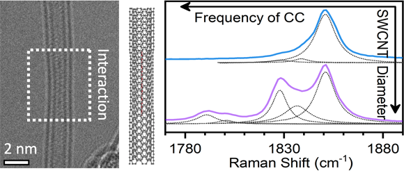 近期,利用单壁碳纳米管转化成的不同直径的双壁碳纳米管为模板,合成了性能可控的一维碳链。如图所示,通过左边的电镜图可以直接观察到一维碳链在双壁碳纳米管中时,碳纳米管的直径变窄,说明两者之间存在较强的相互作用。通过碳纳米管的直径可以控制此相互作用的大小,从而最终实现了一维碳链的性能调控,其带隙可在1.8到2.3电子伏特之间调节(如图中右测的拉曼光谱所示,体现为峰位随着碳纳米管直径的减小而产生红移)。