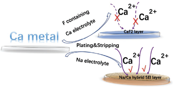 锂离子电池,得益于其稳定优异的储能特性,已广泛应用于各类便携电子产品。随着其能量、功率密度的提升,近年来,越来越多地应用于电动车、智能电网等能量密集型领域。然而,随着市场需求的进一步提高,尤其是电动车对长续航的持续需求,逼近理论极限的传统锂离子电池已渐露疲态。碱金属负极具有较低的理论电位和较高的理论容量(如:锂金属负极质量容量约为3855 mAh g-1,相当于商业化石墨负极的10倍以上),在高比能能量存储领域(>350 Wh kg-1)展现重要潜力。尽管偶尔有报道声称研发出比能量密度大于350 Wh kg-1的单体电池,但受限于枝晶生长、热失控等安全问题,短期内其大规模商业化应用仍不太现实。相比锂而言,钙金属具有更广的丰度、更高的安全性和更和谐的环境友好性,更重要的是二者具相近的理论还原电位(Li, -3V vs. Ca, -2.9 V);而且等物质量的离子,钙离子能传输更多的电荷,也就意味着更大的理论容量。令人遗憾的是,受限于极易退化的电化学沉积/剥离过程,钙金属电化学氧化/还原过程极不稳定,伴随着失控阴离子腐蚀和大幅度的极化电位漂移。究其原因,主要在于缺少合适的电解液体系及与之匹配的稳定电极-电解液界面——固态电解质中间相。