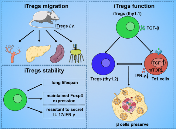 图. STZ-T1DM小鼠iTregs迁移、稳定性及功能模型。iTregs迁移到PBMCs、胰腺、脾脏和淋巴结。iTregs在STZ-T1DM小鼠体内至少存活30天且保持稳定,这表明Foxp3的表达保持不变,并抵抗IL-17和IFN-γ的分泌。iTregs可以保护β细胞功能,可能通过上调受体小鼠的Treg水平,抑制Tc1细胞功能,从而重新平衡受体的Treg/Tc1细胞比例。iTregs对Tc1细胞的作用依赖于TGF-β介导的mTOR和TCF1信号通路的联合作用。