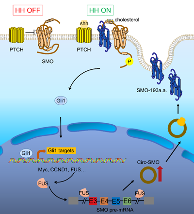为了进一步研究这条通路,张弩教授团队通过12对胶质瘤癌和癌旁样本环状RNA测序,锁定一个高丰度的、在胶质瘤中显著高表达、且由Hedgehog信号通路主要成员SMO基因所形成的环状基因Circ-SMO,进一步的研究证实,Circ-SMO编码一个全新的蛋白,命名为SMO-193a.a.。SMO-193a.a.参与了胶质瘤干细胞自我更新和干性维持,并促进胶质瘤干细胞的体内成瘤能力。通过转录组测序和分子生物学研究发现,SMO-193a.a.结合SMO母蛋白的N端,作为胆固醇的“搬运工”,通过运输胆固醇实现对SMO的激活,且SMO-193a.a.上游调控分子FUS能被shh/Gli1转录激活,从而形成Shh/Gli1/FUS/SMO-193a.a.正反馈的激活环路。SMO-193a.a.在胶质瘤患者中高表达并提示更差的预后,具有作为新的胶质瘤诊断治疗靶点的潜能。