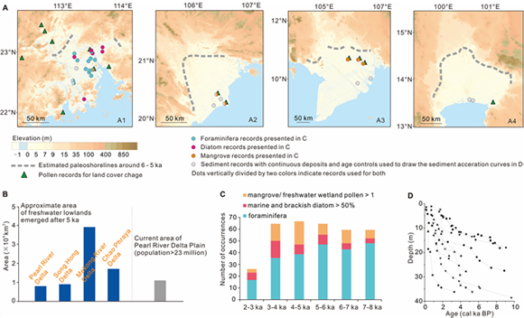 图2. 主要三角洲和海岸平原的演变。(A) 研究区域主要三角洲平原。A1,珠江三角洲;A2,红河三角洲;A3, 湄公河三角洲;A4,湄南河三角洲。灰色虚线显示为距今6-5 ka海岸线的位置。 (B)该区域大型三角洲在5 ka以后出陆的平原面积估算。(C)沉积记录揭示的3-2 ka沉积环境的变化。(D)沉积物年龄-深度曲线显示三角洲沉积速率的变化