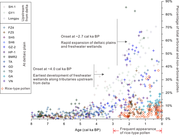 图1. 禾本科和水稻型花粉的变化。不同颜色十字形显示不同钻孔的禾本科记录;红色菱形显示水稻型花粉记录