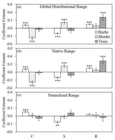该论文通过整合全球维管植物CSR策略评分数据库和植物全球分布范围数据,分析了2645种维管植物的原产地、引入地和全球分布范围与植物的CSR策略评分的关系。研究发现,不同分布区域的植物依赖于不同的功能策略,原产地和引入地的植物借助不同的功能策略实现分布范围扩张;植物在全球和原产地的分布范围与R策略显著正相关,植物在引入地的分布范围与C策略显著正相关,植物原产地、引入地和全球分布范围均与S策略显著负相关(图2)。这些规律在草本植物较木本植物中更为显著。灌木在全球和原产地的分布甚至呈现出与草本完全相反的规律(图2)。这些结果还表明,传统的依赖于植物原产地分布范围预测入侵地分布范围的方法需要结合植物的功能策略进行校正:由于C策略者在引入地更具优势,其在引入地分布范围可能被低估;而由于R策略者在原产地更具优势,其在引入地分布范围可能被高估。