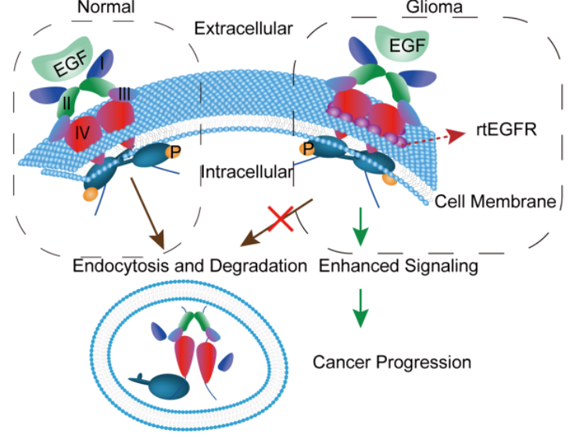 膜受体EGFR扩增以及其下游的络氨酸激酶信号通路激活是脑胶质瘤的显著特点之一,但维持脑胶质瘤中EGFR持续细胞膜定位以及EGFR信号通路激活的机制仍未完全明了。