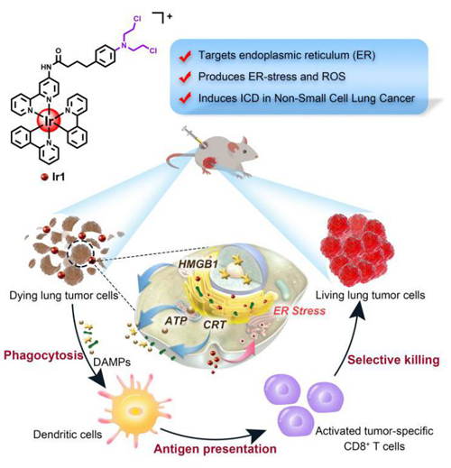 近日,我校化学学院巢晖教授研究团队报道了一例基于铱(III)配合物的非小细胞肺癌ICD诱导剂(Ir1)。 Ir1诱导肿瘤细胞产生ICD,释放损伤相关模式分子(DAMPs),最终激活T细胞相关的免疫应答。据悉,这是首例用于非小细胞肺癌的内质网靶向铱(III)配合物ICD诱导剂。