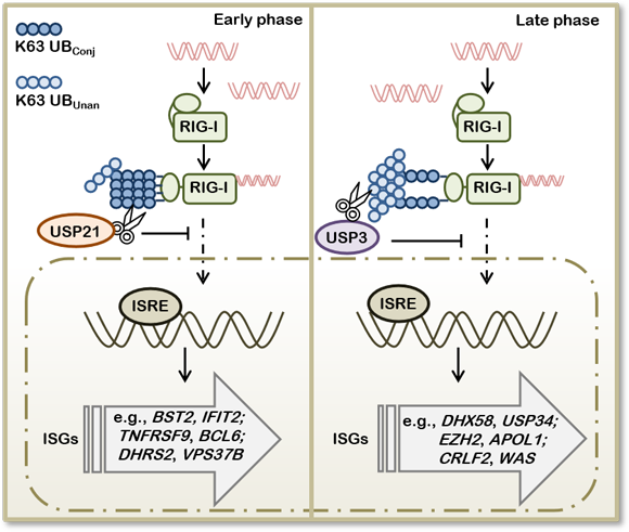 近日,崔隽教授团队发现RIG-I的非锚定与锚定K63泛素化修饰分别调控不同类型ISGs的特异性转录,为细胞存活等多种生物学过程提供了精细调控的手段(图2)。团队发现在病毒dsRNA模拟物poly(I:C)刺激后期,RIG-I的K63泛素链以非锚定结合为主。经过系列筛选,发现RIG-I T55I突变体不能结合K63非锚定泛素链,而不干扰锚定泛素化修饰。通过利用T55I突变体,发现非锚定泛素链的结合对RIG-I介导的I型干扰素信号后期激活的维持起关键作用。通过转录组学的进一步分析,发现RIG-I的非锚定泛素链特异性调控代谢以及细胞死亡相关基因转录。而去泛素酶USP21以及USP3则分别调控RIG-I的锚定以及非锚定泛素链的结合,为细胞感染下的生物学功能以及细胞命运抉择提供了精细调控手段。