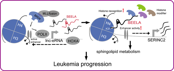 近日,我校生命科学学院陈月琴教授团队揭示了lnc-eRNA SEELA在恶性白血病通过顺式作用激活临近基因的机制。研究发现,恶性白血病中特异性上调表达的lnc-eRNA SEELA被转录激活后,“落地生根”,直接结合组蛋白H4表面的K31位氨基酸。SEELA继而在转录增强子座位发挥双重支架作用,促进增强子组蛋白修饰-修饰识别蛋白的结合,激活增强子活性,最终通过顺式作用激活临近基因SERINC2的转录。功能研究发现,SEELA-SERINC2可以通过影响鞘脂代谢通路介导疾病发生发展(见图1示意图)。该研究首次发现了组蛋白H4可以通过直接结合RNA发挥功能,提示组蛋白H4和lnc-eRNA的结合可能是lnc-eRNA介导顺式作用的基础。该研究继2019年9月在Blood期刊报道环状RNA调控蛋白翻译过程新功能基础上,进一步揭示了新型非编码RNA的作用机制。
