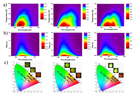 图2、LIFM-WZ-7-9随a) 温度、b) 时间和c) 激发波长的多模调色长余辉