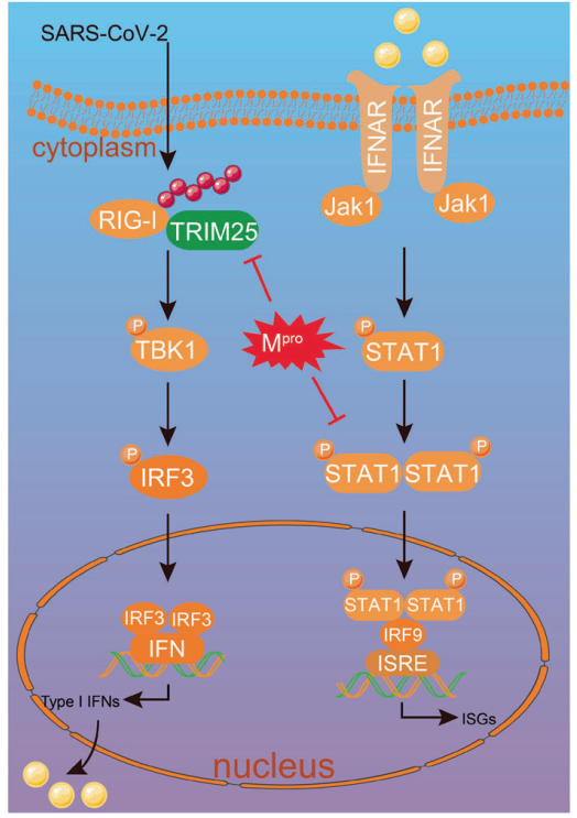 图:新冠病毒Mpro蛋白在不同层次拮抗I型干扰素抗病毒反应