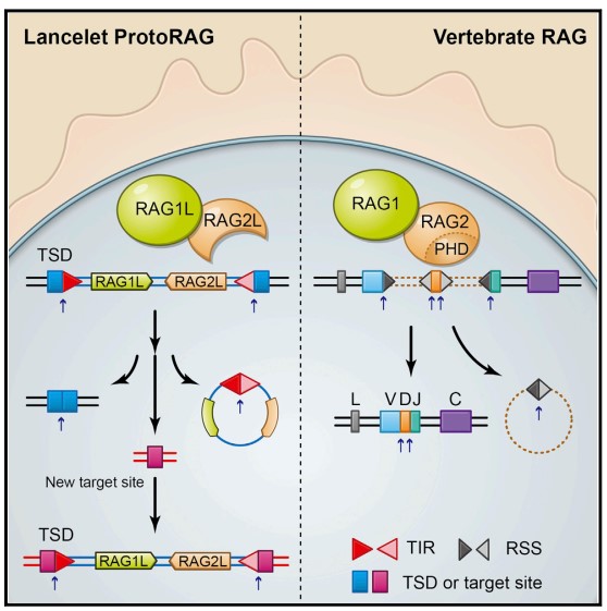 2016 年,徐安龙教授团队在古老物种文昌鱼中发现了原始的RAG 转座子ProtoRAG。研究表明ProtoRAG不仅具有经典的DNA转座子结构,其还编码了两个相向转录的RAG1-like及RAG2-like蛋白。文昌鱼RAG1L/RAG2L复合物具有介导ProtoRAG转座及重组宿主基因组的功能,从而为诺贝尔生理或医学奖获得者利根川进提出的RAG介导的抗体基因重排机制起源于古老的转座子系统假说提供了直接证据,该成果发表在《Cell》杂志(Cell 166, 1–13, 2016)。