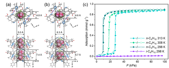 丁烷和异丁烷都有广泛的用途,但分离丁烷异构体非常耗能。基于多孔材料的吸附是一种节能的分离方法,其中分子筛效应最简单高效,但孔径尺寸难以调控。框架柔性可能是一种实现分子筛分离效应的新策略,但其效果和原理存在很大争议。另一方面,共价键和配位键的强度和方向性对维持多孔材料的多孔性至关重要。相比而言,基于氢键或其他弱作用的分子晶体缺乏刚性和设计性,很少体现出多孔性,更难以用于吸附分离。