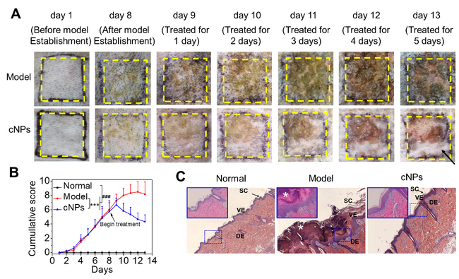 图2. 外用cNP治疗银屑病食蟹猴的结果:(A)皮损表观变化;(B)PASI得分;(C)皮损组织切片HE染色
