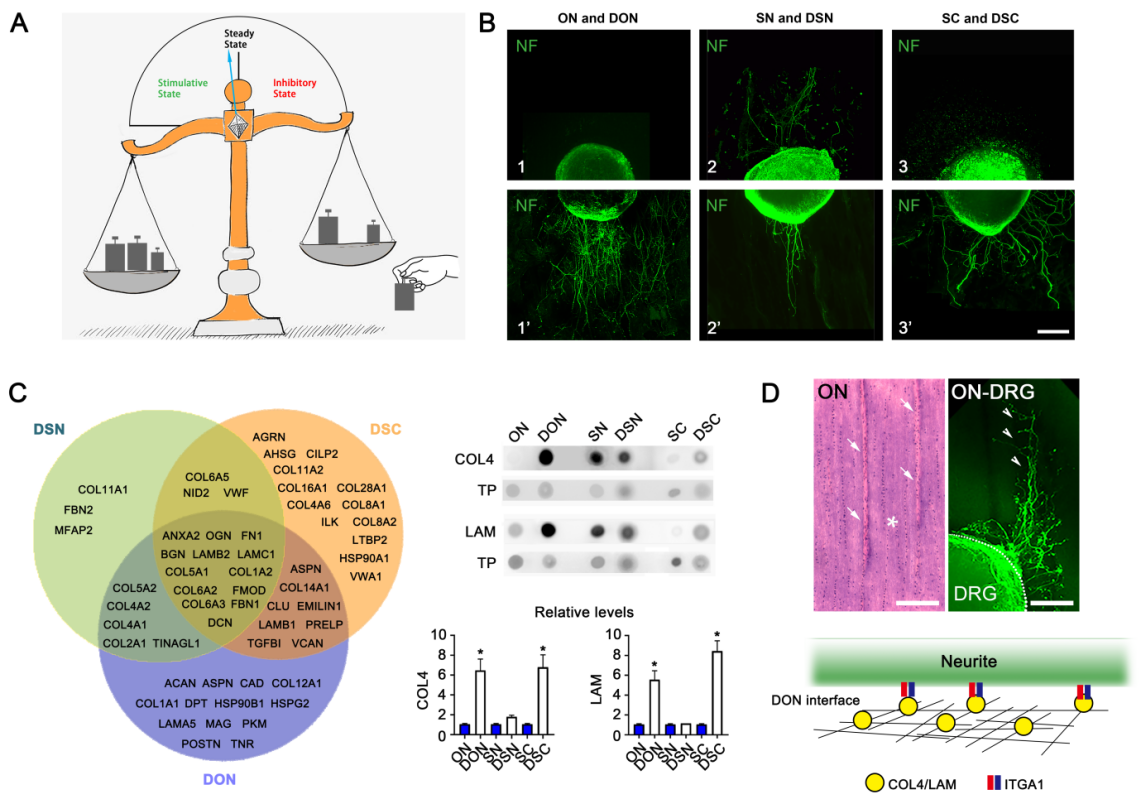 说明:A. 示意脱细胞技术改变了稳定态的中枢神经组织微环境。经脱细胞处理后中枢神经组织的细胞外基质的显著变化是抑制神经再生成份减少,促使神经再生成份比例增多,导致其微环境由稳定态(steady state)转变为促进态(stimulative state)。B. 示三种神经组织(ON, SN, SC)与其对应的去细胞神经组织(DON,DSN,DSC)纵切厚片对DRG神经突起生长的影响。C. 韦恩图显示三种去细胞神经组织(DON,DSN,DSC)所保留的细胞外基质蛋白成份。D. 示正常视神经(ON)纵切厚片结缔组织隔膜(白箭示)与其支持DRG神经突起直行生长(白箭头示)的关系;模式图显示去细胞视神经纵切厚片界面(DON interface)上的COL4/LAM与神经突起(Neurite)上的ITGA1之间的关系。
