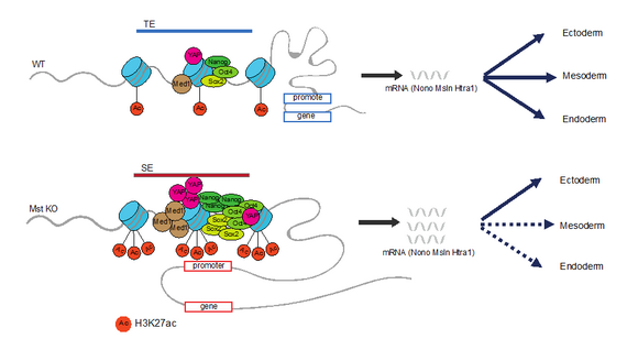 Mst1/2敲除后YAP通过调控超级增强子的形成影响三胚层倾向性分化的模式图