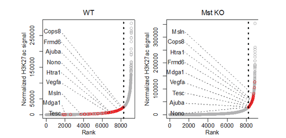 ROSE软件对H3K27ac的ChIP-seq信号排序显示在野生型胚胎干细胞中由传统增强子调控的所列基因在Mst1/2敲除胚胎干细胞中转变为由超级增强子调控