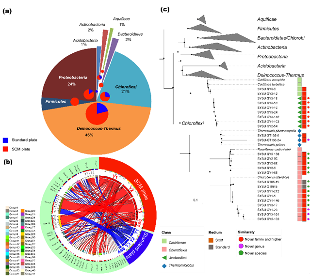 近日,我校生命科学学院李文均教授课题组在国际知名学术期刊npj Biofilms and Microbiomes(IF:6.333,中科院生物学一区,微生物学一区)上发表题为“ Network-directed efficient isolation of previously uncultivated Chloroflexi and related bacteria in hot spring microbial mats”的学术论文。论文作者突破传统培养模式,通过高通量测序及共现网络分析预测热泉菌席微生物的互作模式的思路,实现了绿弯菌的定向分离(图1)。通过对潜在互作的微生物验证,确定了一株具有广泛促生活性的菌株Tepidimonas sp. SYSU G00190W;基于此,团队建立了基于物种互作的“SCM-定向分离”策略,成功分离到大量之前难以培养的微生物类群;最后作者还对其基因组和代谢组做了进一步机理解析和实验验证。