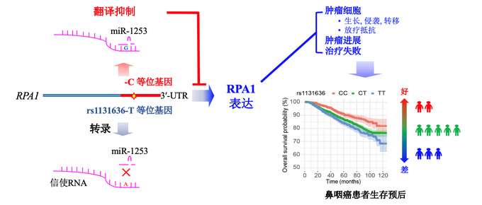 功能学研究发现,位于RPA1基因3′-UTR区域的rs1131636位点对RPA1基因的表达起重要的调控作用。体外细胞模型实验结果表明,RPA1表达上调能够促进鼻咽癌细胞的增殖、侵袭和转移并且提高其对放疗的抵抗性;动物实验结果也证实了RPA1表达上调能够提高鼻咽癌细胞在小鼠体内的成瘤能力;在复发患者肿瘤中,RPA1表达水平显著增加,提示RPA1在鼻咽癌的进展过程中发挥着重要的作用。进一步研究发现,该rs1131636位点等位基因C提高与miR-1253结合能力,抑制其上游基因RPA1的正常翻译,降低RPA1蛋白水平。这些结果提示,相比于rs1131636-CT和-TT基因型,携带-CC基因型患者肿瘤在miR-1253作用下,RPA1表达水平下降,放射射线敏感性提高,肿瘤恶性程度降低,预后情况良好。