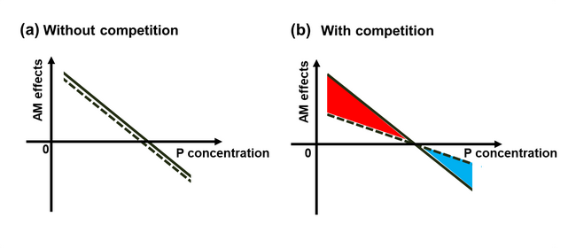 AMF能与超过80%的陆生植物结合,是一类对植物生长有促进作用的有益真菌。大多数外来植物不仅能迅速地与入侵地AMF结合,而且能破坏本地植物与AMF共生关系。因此,AMF一直被认为是促进外来植物入侵的一个重要生物因子。然而,以往的研究表明AMF与植物的相互作用具有磷元素依赖性。低磷浓度时,AMF促进植物生长;而高磷浓度时,AMF抑制植物生长。因此,磷浓度很可能是影响AMF对外来植物入侵促进作用的重要因子。该研究通过对两种华南入侵植物假臭草(Eupatorium catarium)和三叶鬼针草(Bidens pilosa)及其伴生的本地种进行室内控制实验,发现:随着磷浓度增加,AMF对入侵植物和本地植物生长作用都由促进转向抑制(图a)。混种时,入侵植物抑制了本地植物与AMF结合,导致在低磷浓度时削弱了AMF对本地植物生长的促进作用;而在高磷浓度时削弱了AMF对本地植物生长的抑制作用(图b)。因此,AMF对外来植物入侵促进的作用随着磷浓度升高而减弱。