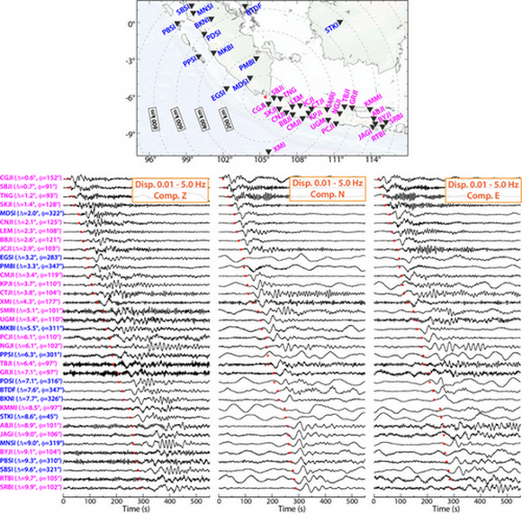 图1. 2018年印尼火山海啸产生的地表振动信号 (Ye et al., 2020, Sci. Adv.)