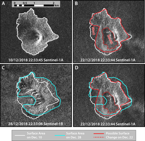 2018年12月22日因无预警海啸致使印尼苏达海峡沿岸城市437人死亡,几千人受灾。叶玲玲教授等利用印尼的宽频带地震波数据,发现此次海啸由滑坡引发,与2018年活跃的Anak Krakatau火山活动有关。相对于地震滑动,滑坡造成的地振动以低频成分为主,高频成分较少(图1),造成目前常规基于高频地振动信号的地震-海啸预警系统失效。雷达影像资料分析进一步证实海啸源是Anak Krakatau火山西南侧的滑坡(图2)。采用震源单力模型,长周期地震波观测约束滑坡平均倾角为12°;结合地震波和卫星遥感资料观测,得到滑动体积约为0.2 km3。这些参数为海啸模拟提供了重要约束。
