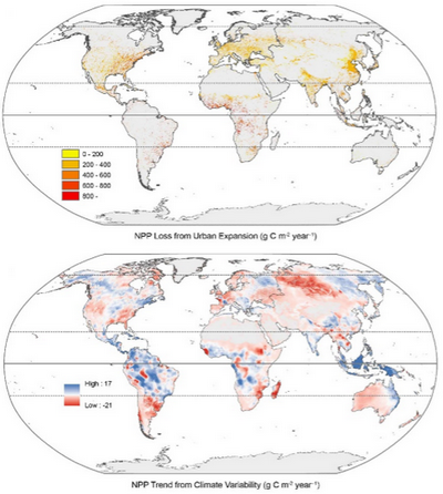 2000-2010年间由全球城市扩张因子和气候驱动因子导致的陆地NPP变化