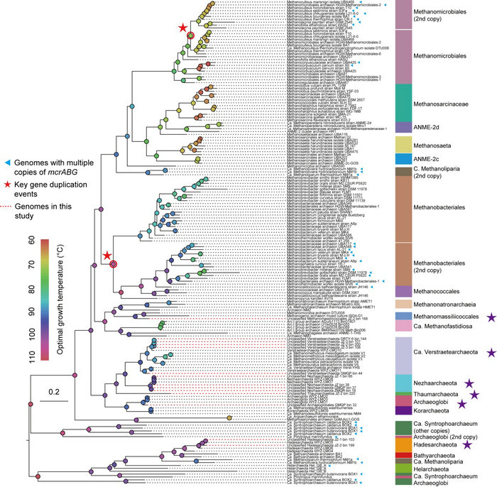 近期,我校生命科学学院李文均教授课题组在国际知名学术期刊Nature Communications发表题为“Insights into ecological roles and evolution of methyl coenzyme M reductase containing hot spring Archaea”的学术论文。研究表明:滇藏热泉生态系统中蕴含着丰富的微生物资源,包含大量的系统发育位置未知且功能奇特的神秘、新颖的微生物类群。课题组结合宏基因组学测序技术和生物信息学手段从中重构出14个具有甲烷/烷烃代谢能力的微生物基因组(图1),其系统发育多样性极高且独特,广泛分布于韦斯特古菌门、哪吒古菌门(Nezharchaeota)等TACK超级门中。值得一提的是,该课题组首次于奇古菌门(Thaumarchaeota)中发现其具有产甲烷功能。此前,奇古菌门以其好氧氨氧化能力而为众人所熟知,而课题组首次对其厌氧状态下产甲烷能力的发现表明我们目前对此门认知的局限性,神秘的自然界或将远远超出我们的认知。此外,组学技术的发展或将指引我们对其进化历史进行更全面的认知。课题组对这些未知生命的代谢特征进行了揭示,并发现除却传统的氢营养型产甲烷菌外,还有多种氢依赖的甲基营养性产甲烷菌,他们可吸收热泉生态系统中多种甲基底物以完成甲烷的产生(图2)。通过进化基因组分析,课题组还对古菌祖先的进化起源进行了推测,研究发现对于具有产甲烷能力的微生物类群,其甲烷代谢关键基因mcrABG相对较为保守,并无明显的水平基因转移时间发生;而对于烷烃氧化的微生物类群,水平基因转移对其多样性塑造有着深远影响。基于甲烷代谢基因的保守性,课题组对其祖先序列进行了序列重构,从而来推测祖先序列的最适生长温度,结果表明具有mcrABG标记基因的微生物类群或起源于高温生境(图3)。另外,由于 TACK和ASGARD超级门中,以及广古菌门中大部分支系均具有甲烷/烷烃代谢能力,且相应微生物相比其它同支系微生物有着更为悠久的进化历史(图1),因此,课题组猜测地球早期生命中,古菌的祖先或具有甲烷和烷烃代谢能力。