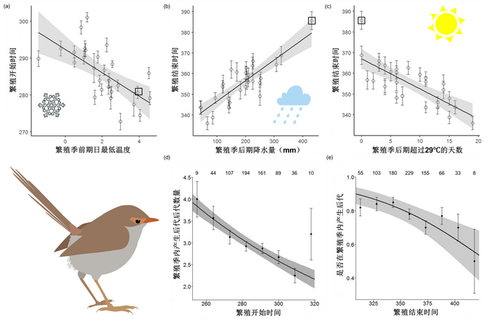 气候对繁殖开始时间(a)和结束时间(b,c)的影响,以及繁殖时间对个体繁殖成效的影响