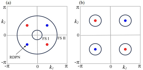 以二维为例,当费米面(黑线)和可移除超导配对节点(红点和蓝点,两种颜色表示相反的拓扑荷)具有如图所示的位型,可实现二维二阶拓扑奇宇称超导体