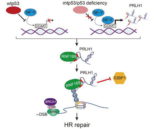 在人类基因组中,逆转座子元件及其衍生物的序列约占40%,其中10%为LTR逆转座子。虽然大部分LTR 逆转座子都具有产生转录本的潜能, 但是一直被认为是垃圾DNA和寄生转录产物,它们在重要细胞生物学过程中的作用并不清楚。屈良鹄教授课题组采用RNA组学技术,从肝癌TCGA数据中鉴定并命名了一个与p53突变相关的、由LTR12C家族衍生的LTR-lncRNA成员PRLH1。该研究发现,PRLH1可与DNA修复蛋白RNF169特异性结合,形成一个稳定的RNA-蛋白质机器,通过排除DSB位点的53BP1蛋白(非同源重组修复关键蛋白),启动DNA同源重组修复(HR)。在这一过程,PRLH1对RNF169的稳定性至关重要。研究还发现,p53可通过NF-Y通路抑制PRLH1在肝癌中表达及其介导的HR修复。p53突变将导致癌细胞同源重组激活,成为癌细胞抵抗凋亡及耐药性的基础,该研究首次揭示了p53通过lncRNA转录调控这种新的作用方式来抑制HR修复(如下图)。