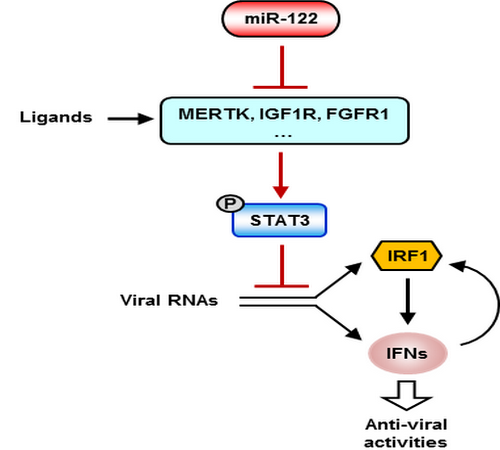 miR-122调控STAT3磷酸化及干扰素反应的机制示意图