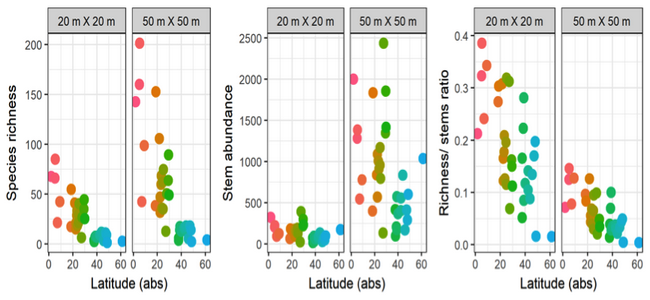 树木物种多样性等随纬度梯度的变化格局