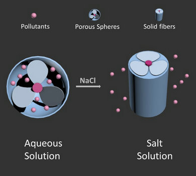 近日,我校化学学院黄哲钢教授课题组以咔唑为中心,在其2,7,9号为分别进行芳基化,制备了新型的二维、三维的螺旋桨状芳香性两亲物, 并通过折叠芳香性平面的组装制备了空心球。与传统的基于一维芳香性分子的超分子多孔材料相比,二、三维π-共轭组装体在水溶液中提供了疏水性碳环境,可以吸附回收水中的有机污染物。研究结果表明,制备的介孔球对有机污染物—乙炔雌二醇(Eo)和双酚A(BPA)的回收率分别为92%和90%。值得注意的是,介孔球可以识别盐的浓度。随着盐的加入,折叠的芳香性分子被观察到逐渐变得平坦,诱导强的π-π相互作用,使多孔球体融化并相连一起形成实心的纤维。这种多孔向无孔材料的转变引发被吸附的污染物从多孔结构中自发释放,而随后的透析使超分子多孔结构恢复吸附容量。