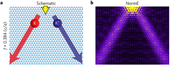 光学能谷霍尔效应。(a)能谷-赝自旋锁定;(b)电场分布。