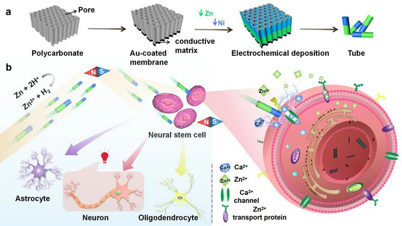 图1 Ni-Zn微马达的制备及靶向激活神经干细胞和引导细胞分化的示意图