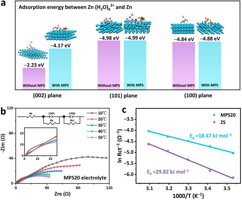 近期,该团队在前期工作的基础上深入研究该类表面活性剂的作用机制,筛选出具有相近分子结构的表面活性剂3-巯基-1-丙烷磺酸钠(Sodium 3-mercapto-1-propanesulfonate, MPS) 添加剂。该表面活性剂分子通过其磺酸根(-SO3)基团吸附于锌负极表面,而其巯基(-SH)基团则对于络合锌离子具有积极作用。理论研究表明(如图1a所示),MPS分子与锌(100)和(101)晶面具有更强的吸附能力,因此更倾向于在这两个晶面上优先吸附。MPS的吸附占据锌离子沉积的位点,而暴露的(002)晶面可提供更多的位点用于锌离子沉积。此外,在吸附MPS分子后,仅有(002)晶面对锌离子的吸附能大幅增加,这意味着更多的锌离子被吸附到(002)晶面。进一步电化学测试研究(图1b,c)证实,新形成的MPS吸附层能够有效降低电荷转移阻抗和锌离子去溶剂化所需的活化能,从而减小锌沉积能垒,使锌沉积更加均匀。因此,MPS分子的引入有效地调控了负极/电解液之间的界面结构,实现了锌离子在(002)晶面上优先沉积,并最终形成(002)晶面织构的锌负极。