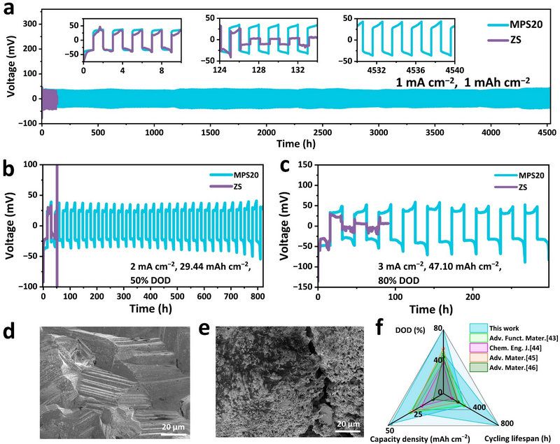 (002)晶面的择优沉积促使锌以最紧密的结构形式生长,从而减少副反应的发生。在MPS界面调控作用下,Zn||Zn对称电池在1 mA cm-2/1 mAh cm-2循环条件下的寿命由130小时提升至4500小时。此外,由于MPS对负极/电解液界面的动态调节,在高利用率下依然保持其在负极表面的特性吸附,进而利于提高电池在高利用率下的性能。基于此,电池在50%和80%的高放电深度下进行恒流电镀/剥离循环测试结果表明,含MPS添加剂的电池表现出优异的循环稳定性,分别达到了800和300小时的循环寿命,远超对照组的50和30小时。通过对照性能雷达图可以看出,该项研究在放电深度、循环寿命、容量密度三项指标方面均优于此前已报道的研究工作,见图2。对高利用率下循环后的锌负极表征结果显示,形成的锌镀层依然保持(002)晶面织构,且表面保持光滑,没有明显的副产物生成。