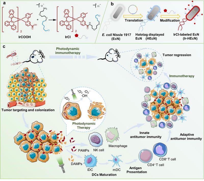 近日,bat365在线中国登录入口化学学院的夏炜教授、毛宗万教授和温州医科大学的沈建良教授合作,开发了一种新型铱(III)光敏剂-细菌杂交体(Ir-HEcN),其能够靶向肿瘤部位,在光照下实现肿瘤的光动力免疫治疗。课题组首先对益生菌E. Coli Nissle 1917 进行基因工程改造,使其表面过表达HaloTag蛋白,并合成了带有氯代正己烷结构的环金属铱(Ⅲ)配合物IrCl。基于HaloTag蛋白与氯代正己烷结构之间形成的共价键,IrCl可以稳定地锚定在Nissle 1917 表面。(图1)