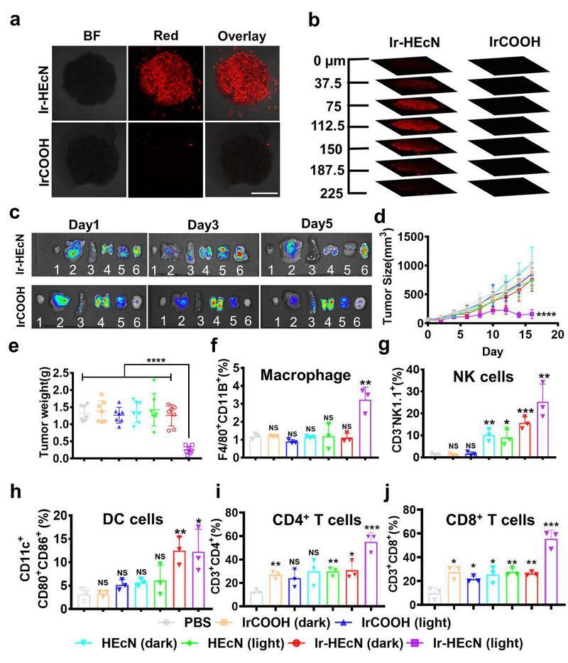 图2. (a)(b)MDA-MB-231细胞球磷光成像 (c)荷瘤小鼠各器官及肿瘤离体成像(d)荷瘤小鼠肿瘤生长曲线(e)荷瘤小鼠肿瘤体积(f)(g)(h)(i)(j)肿瘤部位免疫细胞浸润率