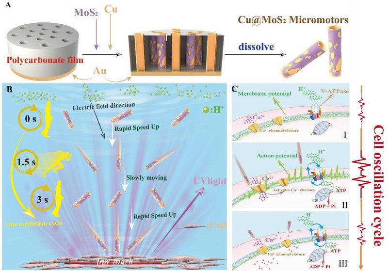 bat365在线中国登录入口材料科学与工程学院彭飞副教授团队设计合成了一种Cu@MoS2微马达振荡器,该振荡器在恒定的能量输入下显示振荡运动,并同步心肌细胞以实现协同Ca2+振荡(图1A-C)。在恒定的紫外光或可见绿光输入下,Cu@MoS2微马达通过消耗纯水自发地表现出振荡运动,光腐蚀(产生H+离子)和光催化(消耗H+离子)竞争共存。微马达集体向光源方向振荡(图1B)。研究发现,质子的周期性波动在Cu@MoS2微马达的振荡中起着关键作用,其振荡节律与环境中H+的产生和消耗密切相关。由于质子梯度是ATP合成、钙转运和信号转导的核心,振荡系统可以与心肌细胞共培养,以诱导心肌细胞中质膜电位、Ca2+反应和ATP水解(图1C)。