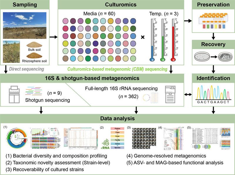 尽管基于直接宏基因组学测序(如16S rRNA扩增子、鸟枪法测序)或培养组学(Culturomics)的微生物组学研究不断取得令人振奋的重要发现,但这两种技术目前仍存在诸多局限性。例如,直接宏基因组测序数据的实用性与群落的复杂度和生物量、测序技术和参考数据库等高度相关,这些均可能会导致群落中大量低丰度细菌类群或一些特定类群被忽略;而培养组学通常被认为是劳动密集型的,其可能会遗漏群落中的一些重要特定类群,且难以获取全面的菌株数据集信息。有研究表明,选择性培养富集以降低群落复杂性的策略可能有助于特定环境中微生物群落的宏基因组学研究。然而,在此之前,尚未有结合培养组学和培养富集宏基因组测序两种方法对沙漠微生物组进行挖掘的研究报道。