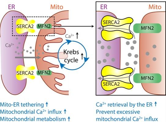 MFN2介导线粒体-内质网耦连的机制目前尚有争议。既往研究指出除了经典的线粒体外膜定位外,MFN2还可能存在内质网定位,进而通过同源互作介导该过程。而在本研究中,研究者通过细胞组分分析实验发现T细胞内质网上并无MFN2。研究者纯化出全长MFN2蛋白,与T细胞裂解物共孵育后通过LC-MS/MS实验鉴定了潜在与MFN2互作的内质网蛋白—SERCA2,随后应用多种实验手段证实了MFN2和SERCA2的相互作用。