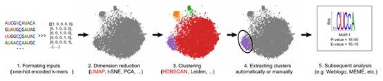 传统的序列分析工具通常基于序列出现的频率进行统计,从而获得高频出现的序列特征(即motif)。这些分析工具(如MEME,HOMER)为发现转录因子结合位点(TFBS)而设计——对于RNA修饰的motif发现并没有进行优化。与TFBS的motif发现的情境不同,RNA修饰位点的序列是高度对齐的,且motif的长度往往很短。实际上,RNA编辑修饰motif的发现与单细胞测序中的可视化流程十分相似:RNA编辑修饰motif可以通过One Hot encoding转化成高维向量,而这些高维向量可以通过Manifold法进行分解,(如UMAP,t-SNE)投影在二维平面上——与motif这一概念一致,如存在反复出现的相似的序列,它们将在二维投影的某个区域形成富集(高密度区域)。若能使用某种手段对投影进行聚类,并提取这些富集区域,就能够以可视化的形式对给定序列进行分类以及motif的发掘。
