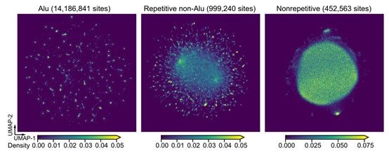 传统的motifs 搜索工具通常仅适用于小规模数据集,而iMVP通过引入UMAP和HDBSCAN技术,并且通过使用GPU加速,成功应对了处理极大RNA修饰位点数据集的挑战。研究团队使用iMVP工具进行了对包含1500万个A-to-I RNA编辑位点进行分析。他们观察到不同类型的A-to- I RNA编辑位点在Alu、非Alu重复和非重复区域中呈现出截然不同的模式。进一步应用iMVP工具,他们获得了高分辨率的数据结果,成功识别出各类编辑位点的簇群。