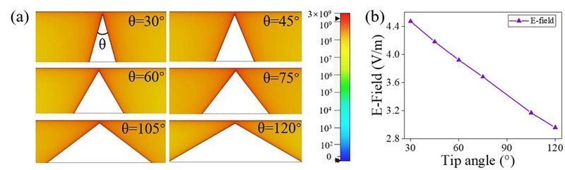 图2 :(a) 不同顶角单层WS2场发射的电场分布模拟;(b) 二硫化钨尖端的场强与顶角之间的关系