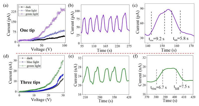 图3: (a, d) 单层WS2单针尖或三针尖器件在不同辐照条件下的I-V曲线;(b、e) 单层WS2单针尖或三针尖器件在绿光照射下的光响应曲线;(c、f) 相应提取的上升和下降光响应曲线