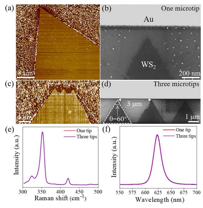 图1: (a,b) 单层WS2微针尖平面场发射器件的AFM和SEM图;(c,d) 三针尖器件的AFM和SEM图。其中白色虚线给出了针尖位置,三个针尖的顶角均约为60°;(e,f) WS2单针尖或三针尖的拉曼光谱和荧光光谱
