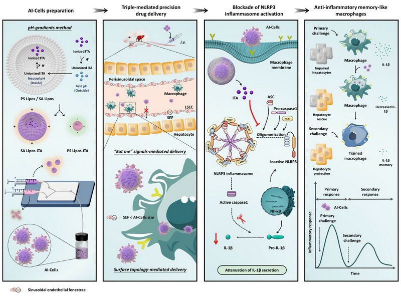 研究团队基于肝衰竭病理特征,设计了一款负载衣康酸的人工治疗细胞AI-Cells(图1)。AI-Cells模拟凋亡细胞的拓扑结构和细胞膜组成,成功实现了对肝巨噬细胞的精准捕获。并通过干扰NLRP3炎症小体的自组装调控肝巨噬细胞使其恢复稳态;同时诱导抗炎记忆样巨噬细胞产生,进而对急性肝衰竭和肝再损伤产生了良好的治疗作用。
