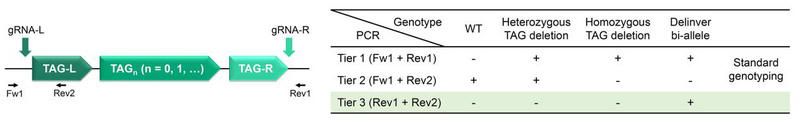 图2. 新的PCR鉴定策略能够区分串联同源基因的纯合敲除突变体与敲除/倒置双等位突变体。左图为串联同源基因(TAG)的CRISPR敲除策略示意图,图中展示了成对gRNA的靶点以及基因型鉴定所用PCR引物的靶点。右图为基因型鉴定PCR的结果与基因型之间的对应关系。四种基因型从左至右依次是野生型、杂合TAG敲除、纯化TAG敲除、TAG敲除/倒置双等位。加号和减号分别代表使用对应PCR引物获得或未获得PCR扩增产物。